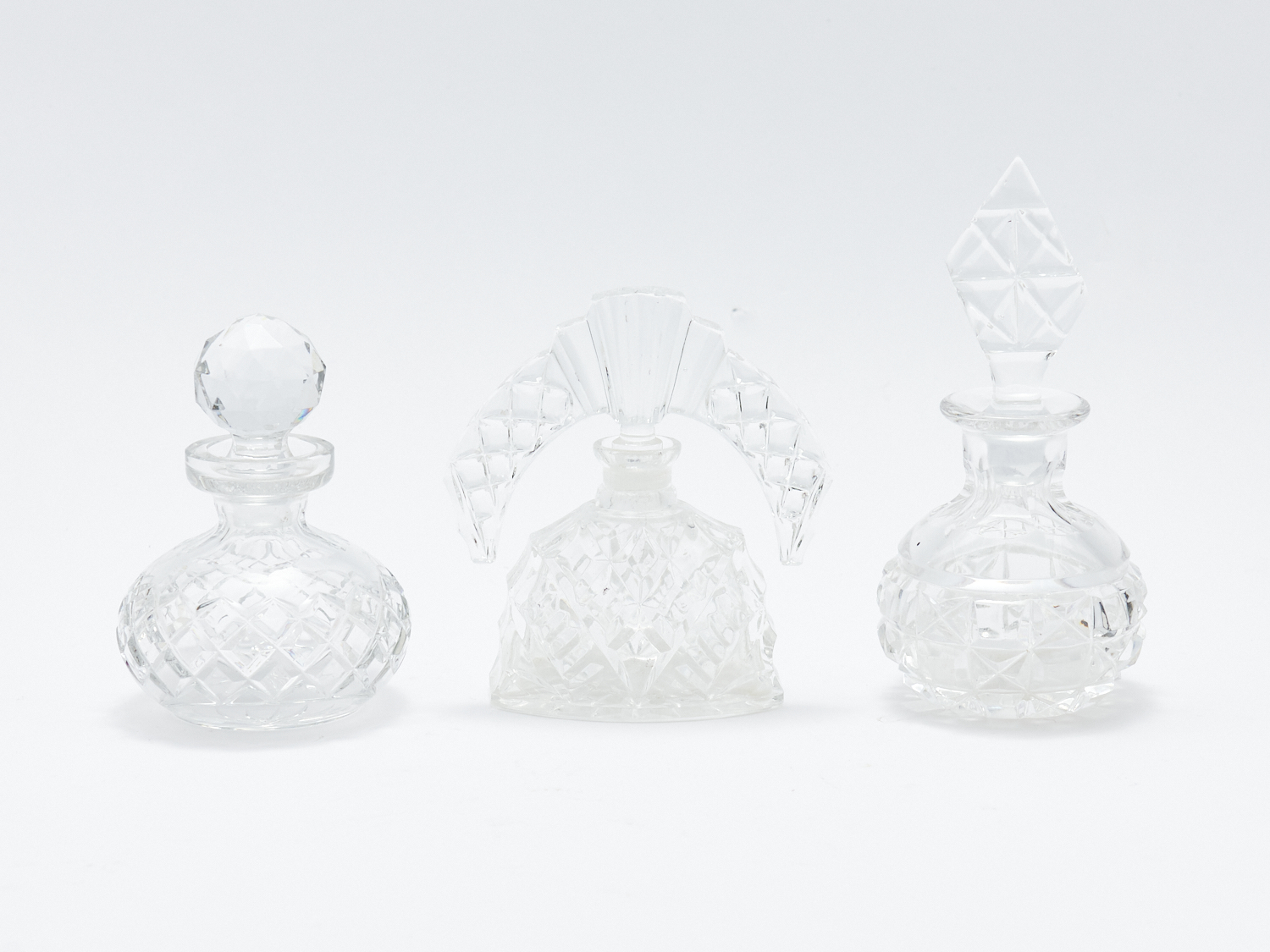 A COLLECTION OF THREE ART DECO CRYSTAL PERFUME BOTTLES, H.12.5CM (TALLEST), LEONARD JOEL LOCAL DELIVERY: SMALL