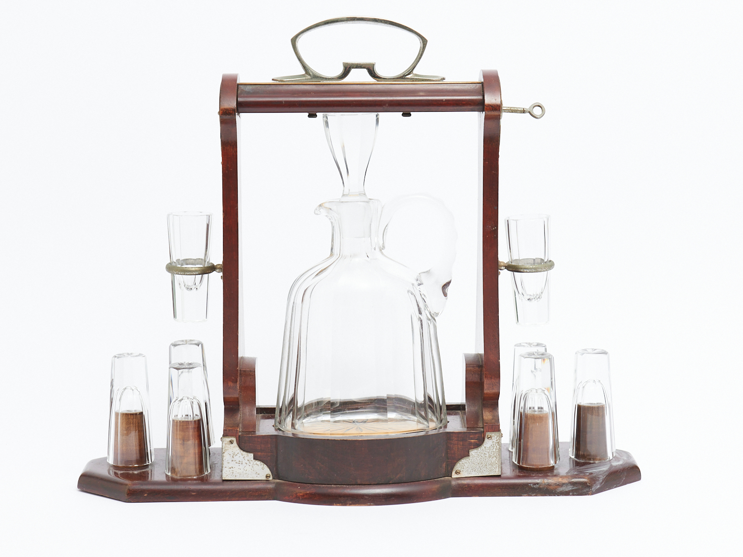A MAHOGANY AND SILVER PLATE FRAMED TANTALUS COMPLETE WITH EIGHT GLASSES AND DECANTER, H.33 X W.40CM, LEONARD JOEL LOCAL DELIVERY: MEDIUM
