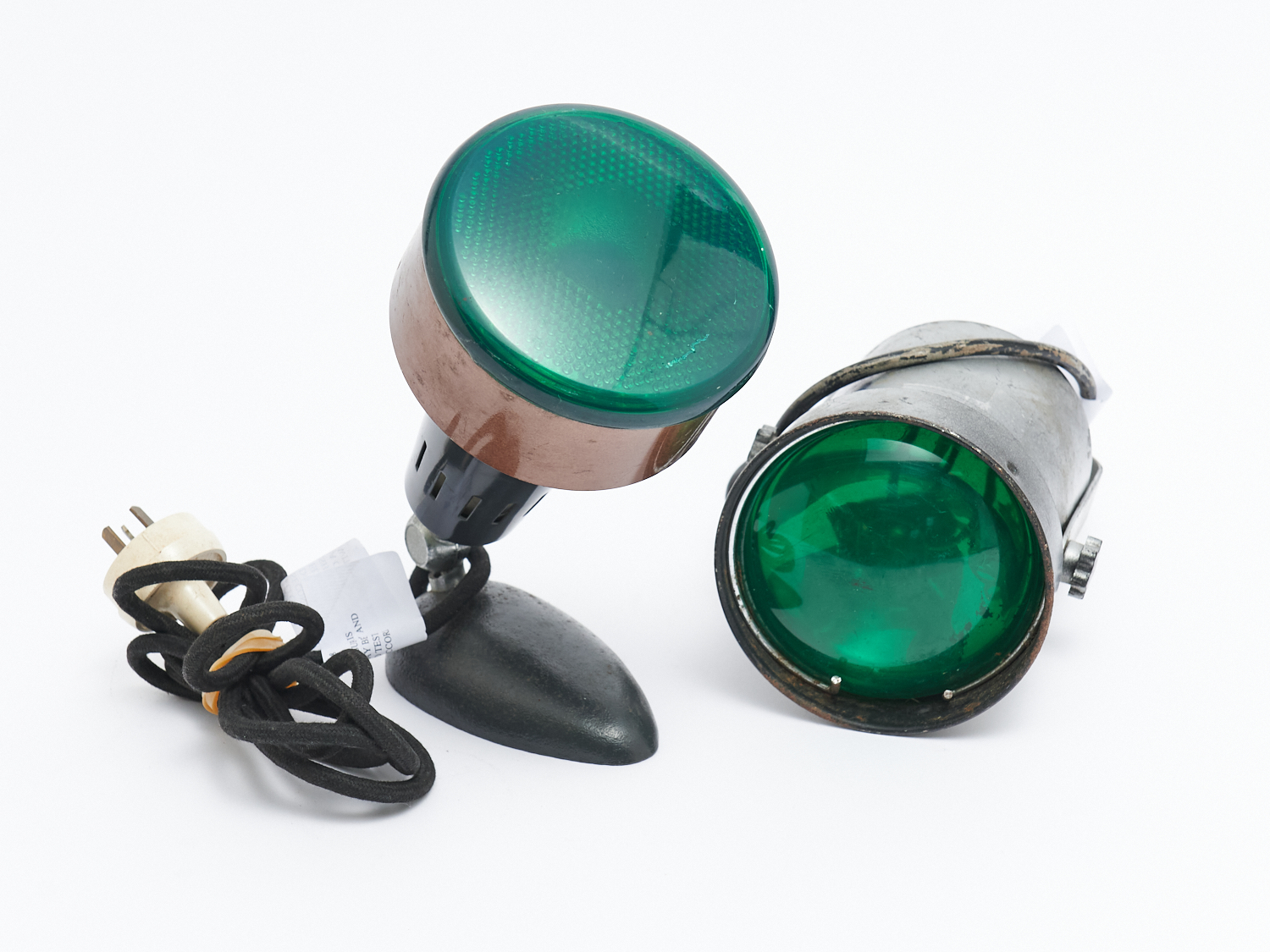 TWO METAL BASED GREEN GLASS LAMPS INCLUDING ONE LEONORA, H.24CM, LEONARD JOEL LOCAL DELIVERY: MEDIUM
