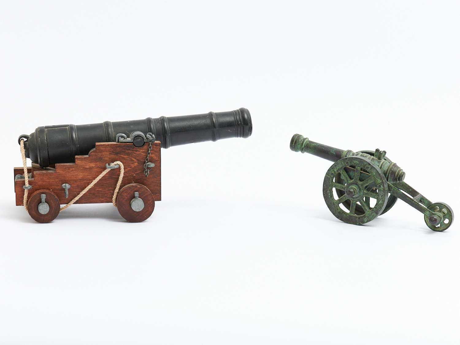 TWO DESK CANNONS INCLUDING ONE BRONZE AND ONE WOOD AND METAL, W.26.6CM (LARGEST), LEONARD JOEL LOCAL DELIVERY: SMALL