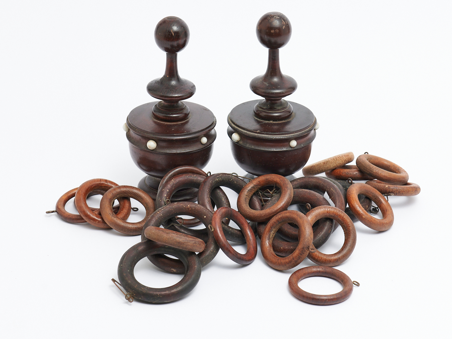 A COLLECTION OF WOODEN CURTAIN ENDS AND RINGS WITH INSET PORCELAIN DETAILS, LEONARD JOEL LOCAL DELIVERY: SMALL