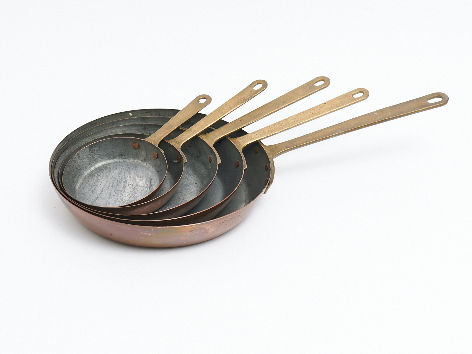 A GRADUATED SET OF FIVE FRENCH COPPER PANS, DIA.23CM (LARGEST), LEONARD JOEL LOCAL DELIVERY: MEDIUM