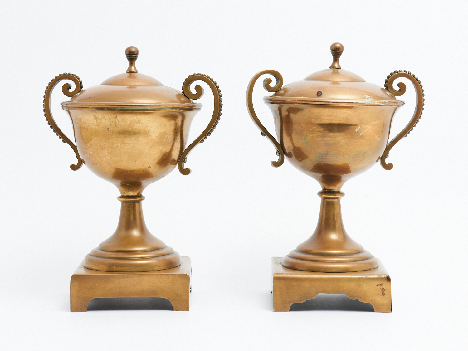 A PAIR OF 19TH-CENTURY LIDDED BRASS TWO HANDLED URNS, H.30CM, LEONARD JOEL LOCAL DELIVERY: MEDIUM
