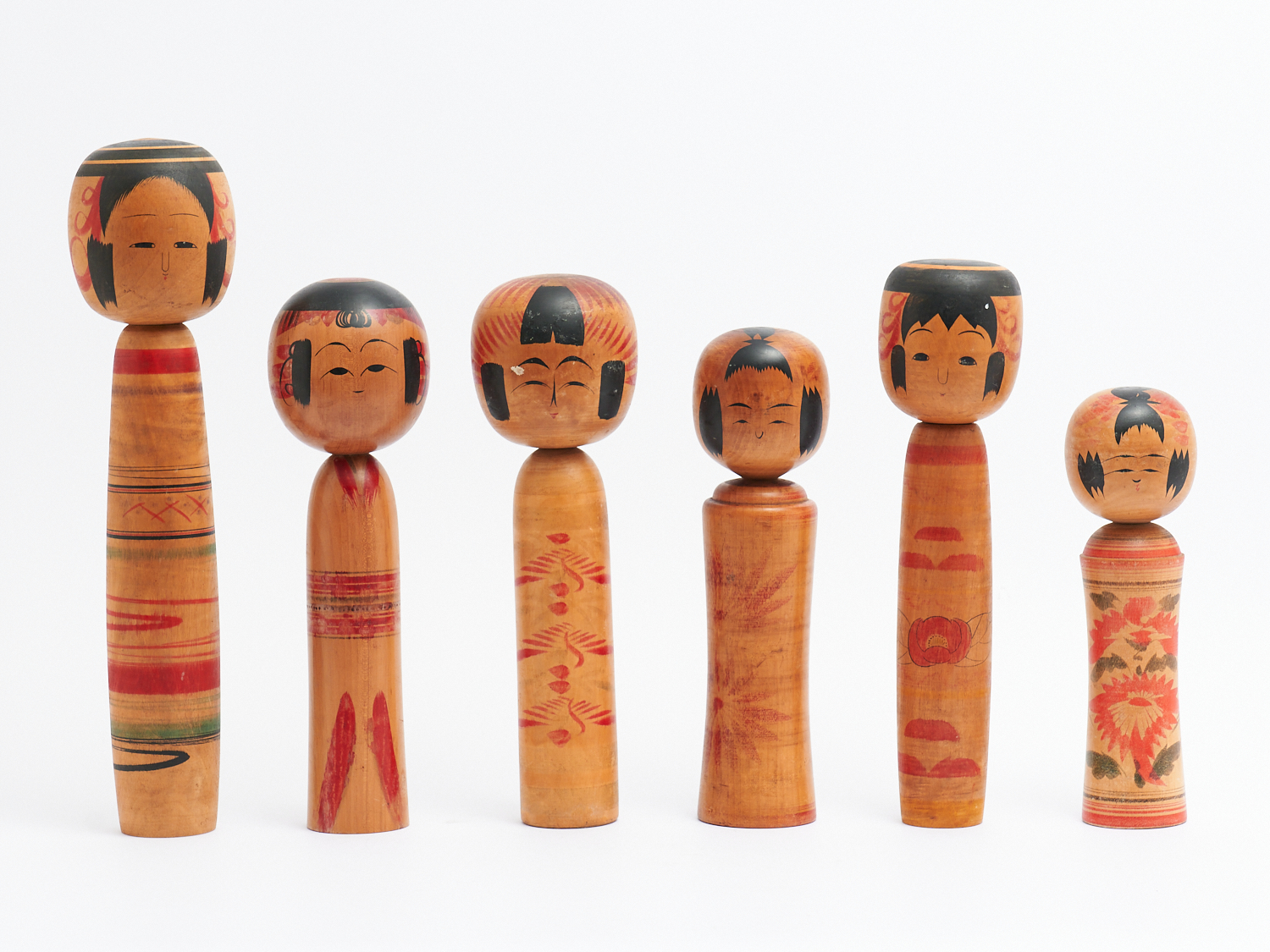A GROUP OF SIX MID CENTURY JAPANESE HAND PAINTED WOODEN KOKESHI DOLLS, H.37CM (TALLEST), LEONARD JOEL LOCAL DELIVERY: MEDIUM