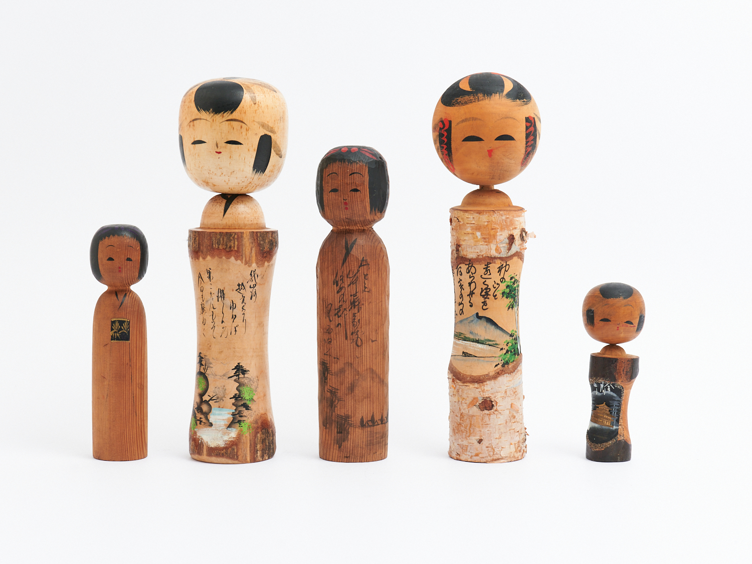 A GROUP OF FIVE MID CENTURY JAPANESE HAND PAINTED KOKESHI DOLLS, H.30CM, LEONARD JOEL LOCAL DELIVERY: SMALL