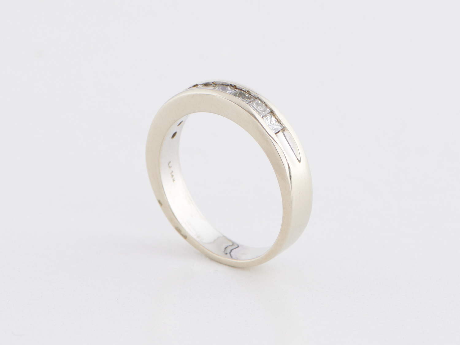 A DIAMOND SET RING IN 14CT WHITE GOLD, THE NINE PRINCESS CUT DIAMONDS TOTALLING APPROXIMATLEY 0.75CTS, APPROXIAMTE RING SIZE N, APPROXIMATE WEIGHT 5.00GMS