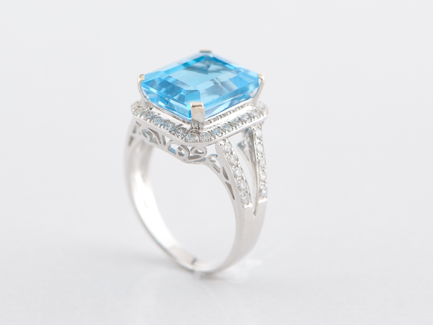 A BLUE TOPAZ AND DIAMOND RING IN 14CT WHITE GOLD, THE TOPAZ TOTALLING 7.93CTS, THE DIAMONDS TOTALLING 0.58CTS, SIZE M, 5.67GMS