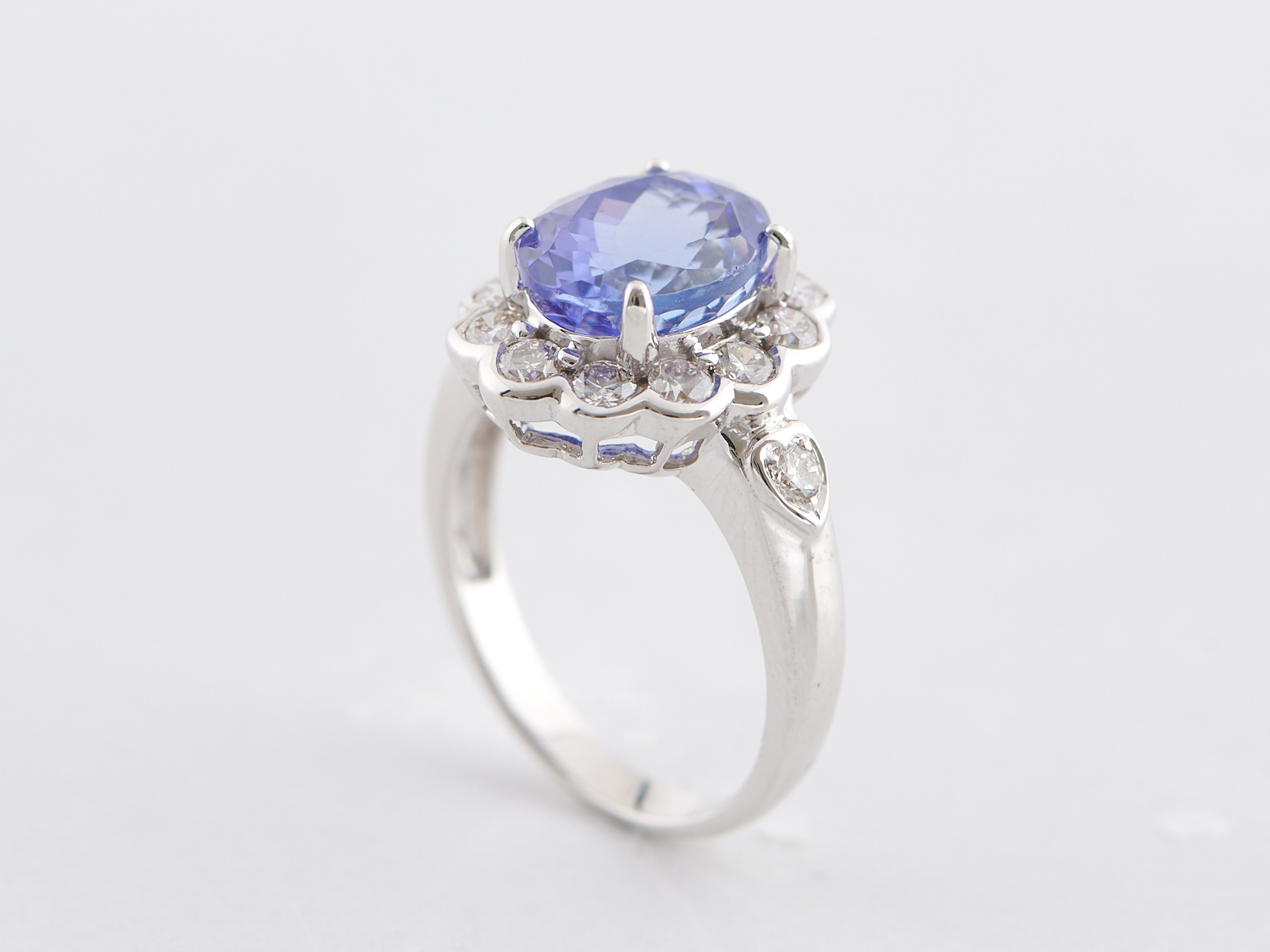 A TANZANITE AND DIAMOND RING IN 14CT WHITE GOLD, THE TANZANITE WEIGHING 4.44CTS, THE DIAMONDS TOTALLING 0.88CTS, RING SIZE N, 5.53GMS