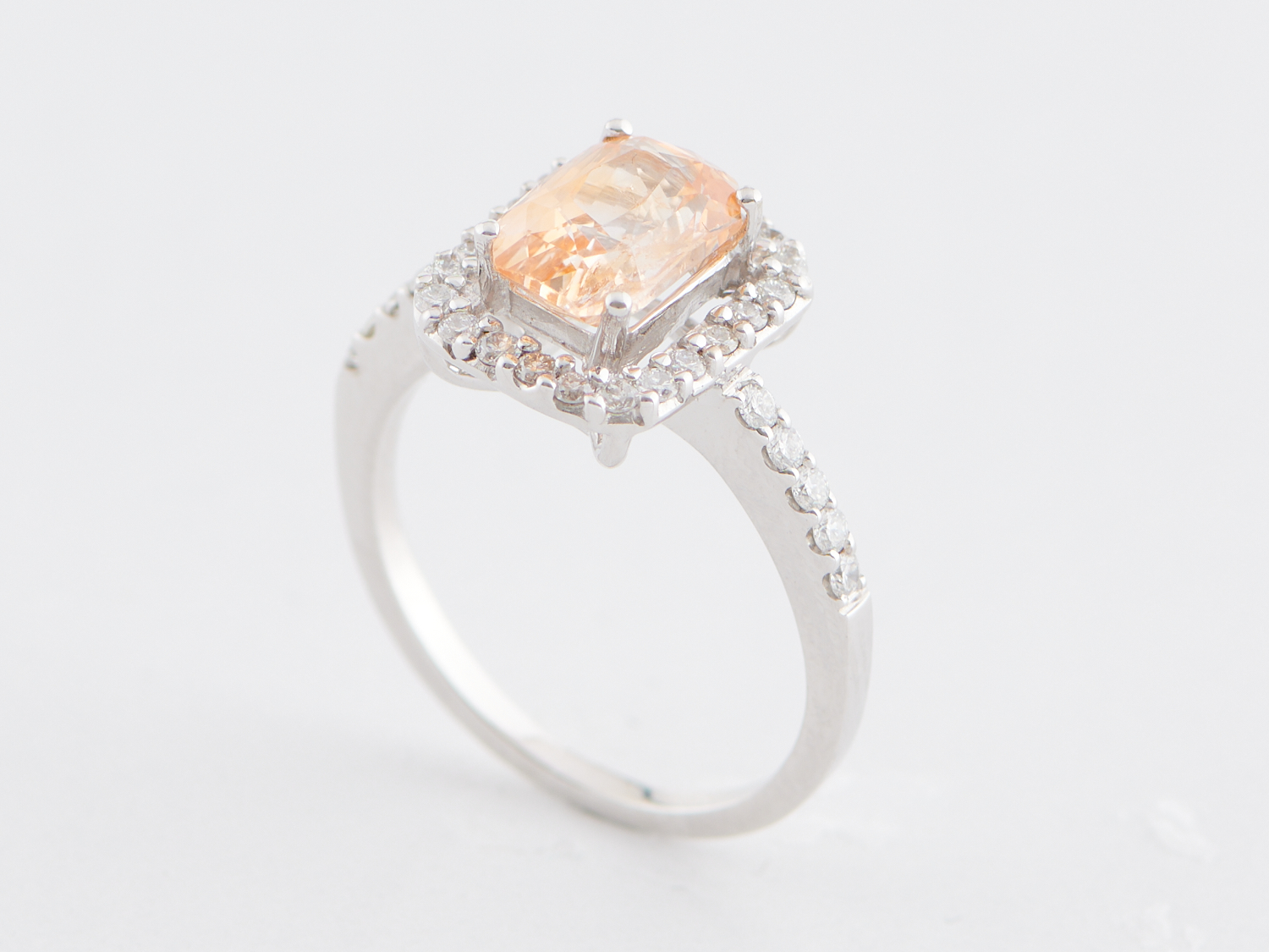 A PADPARASCHA SAPPHIRE AND DIAMOND RING IN 14CT WHITE GOLD, THE SAPPHIRE TOTALLING APPRPOXIMATLEY 2.19CTS, APPROXIMATE RING SIZE L-M, APPROXIMATE WEIGHT 3.4GMS.