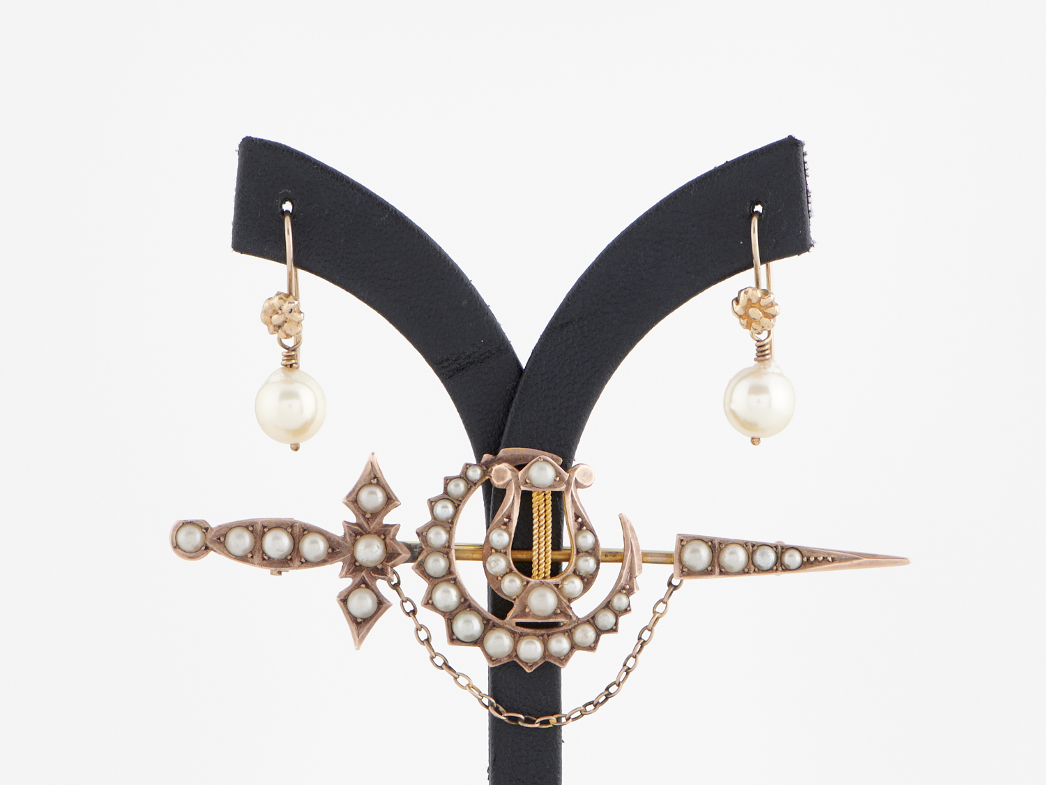 A SEED PEARL BROOCH AND A PAIR OF PEARL EARRINGS IN 9CT GOLD, APPROXIMATE BROOCH SIZE 23 X 76MM, APPROXIMATE EARRING SIZE 6 X 24MM, TOTAL WEIGHT 8.57GMS