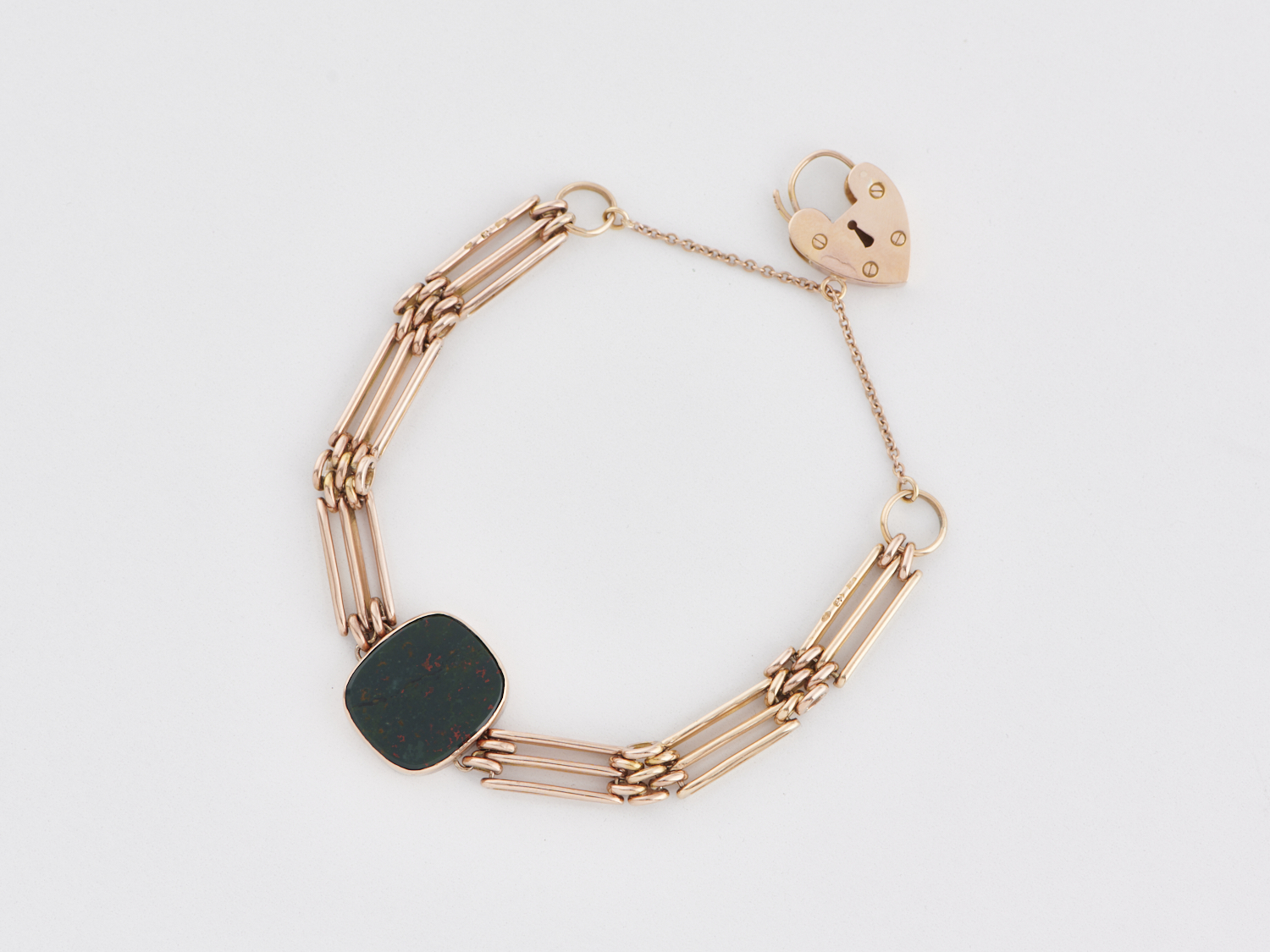 A BLOOD STONE GATE LINK BRACELET IN 9CT GOLD, BERMINGHAM HALLMARKS, TOTAL WEIGHT 26.81GMS