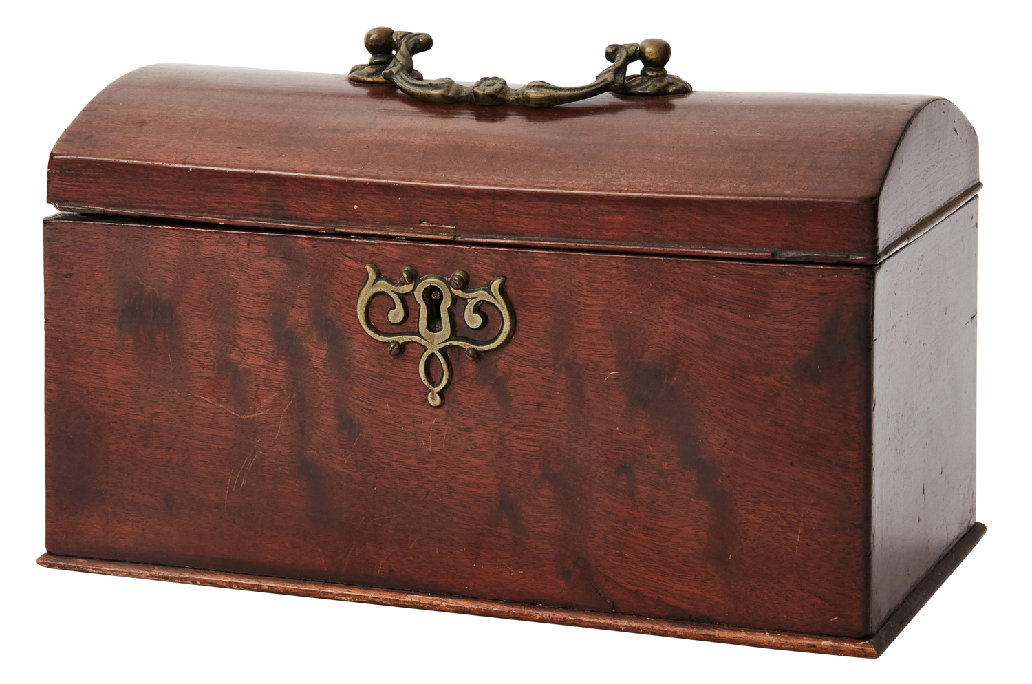 The domed rising top with brass handle opening to reveal two zinc canisters.