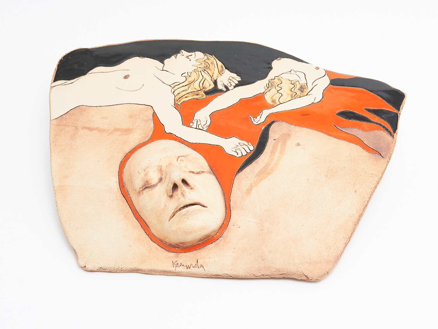 AN ENAMELLED TERRACOTA PLAQUE WITH FACE, SIGNED W.51CM, LEONARD JOEL LOCAL DELIVERY: MEDIUM