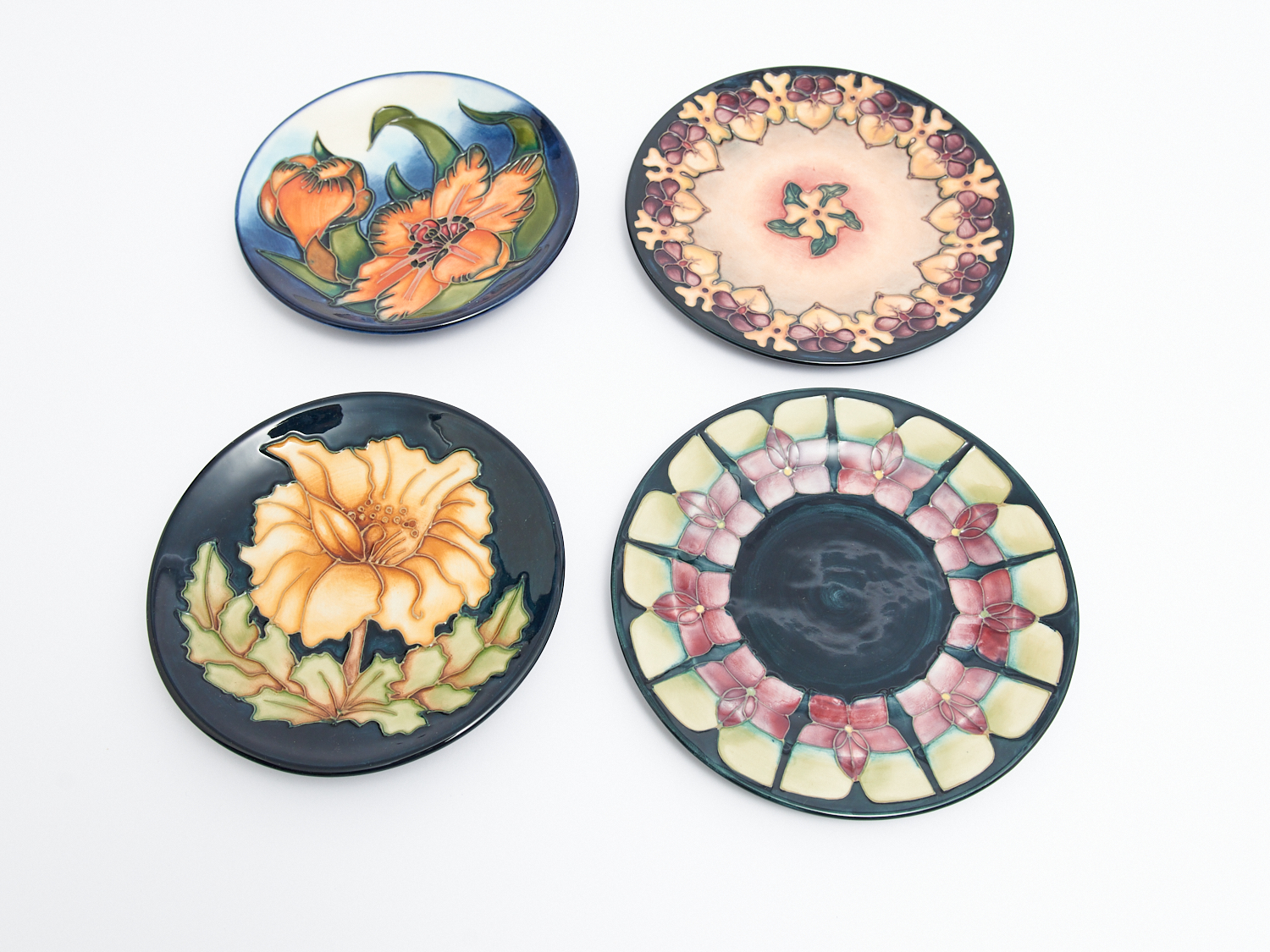 FOUR MOORCROFT PLATES INCLUDING "VIOLET" AND "OBERON" TEA PLATES, DIA.18CM (LARGEST)