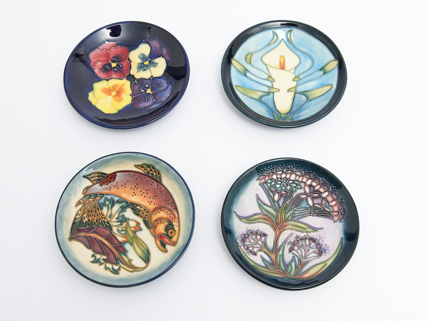 FOUR MOORCROFT PLATES INCLUDING "TROUT" AND "GYPSY", DIA.11CM