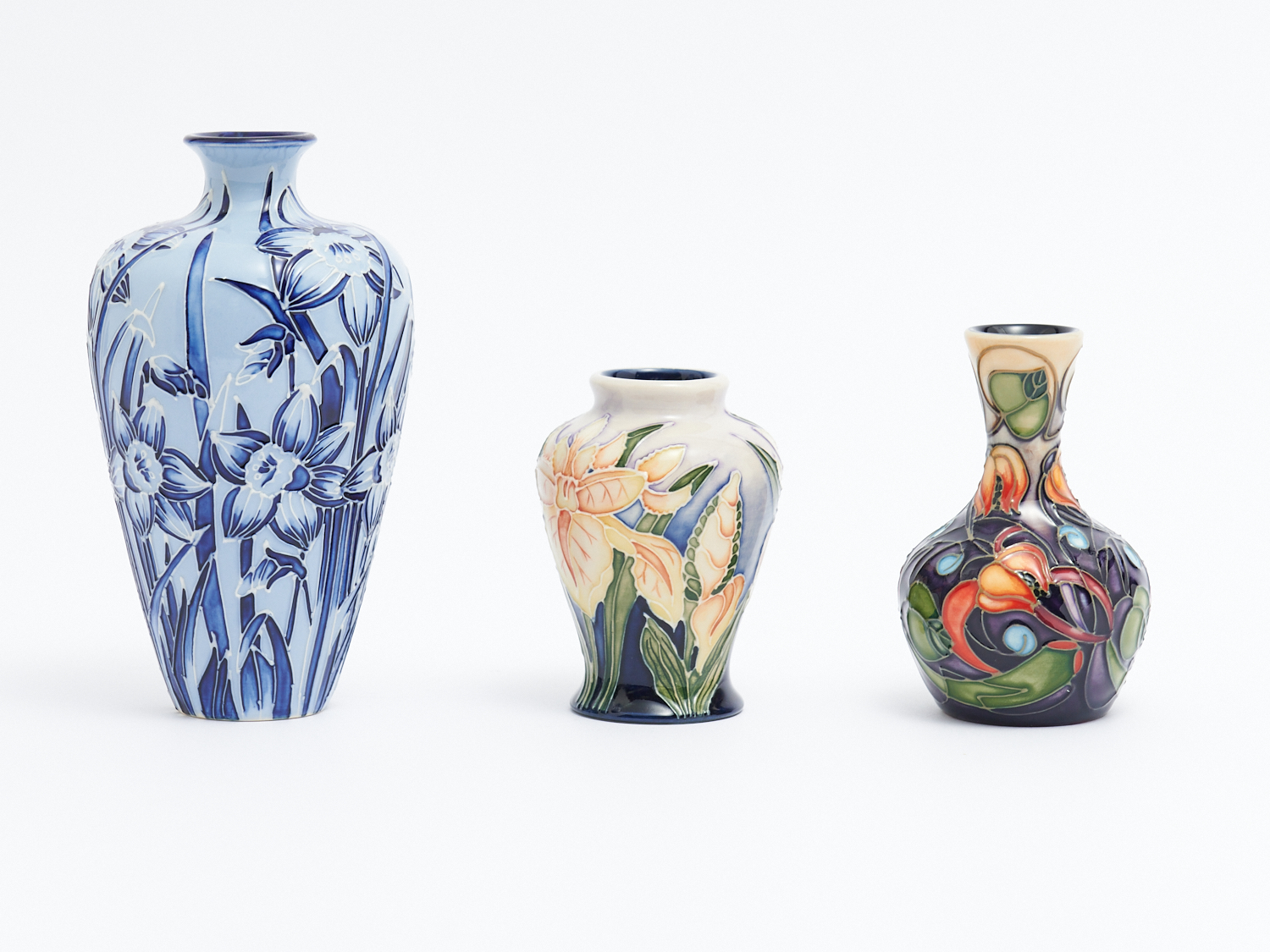 THREE MOORCROFT VASE INCLUDING "TAZETTA", "C.WEB" AND "WINDRUSH", H.18CM (TALLEST)