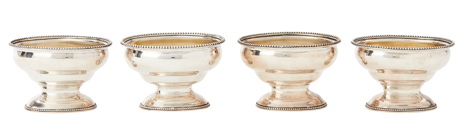 A SET OF THREE GEORGE III SILVER SALTS AND A MATCHING WILLIAM IV EXAMPLE
