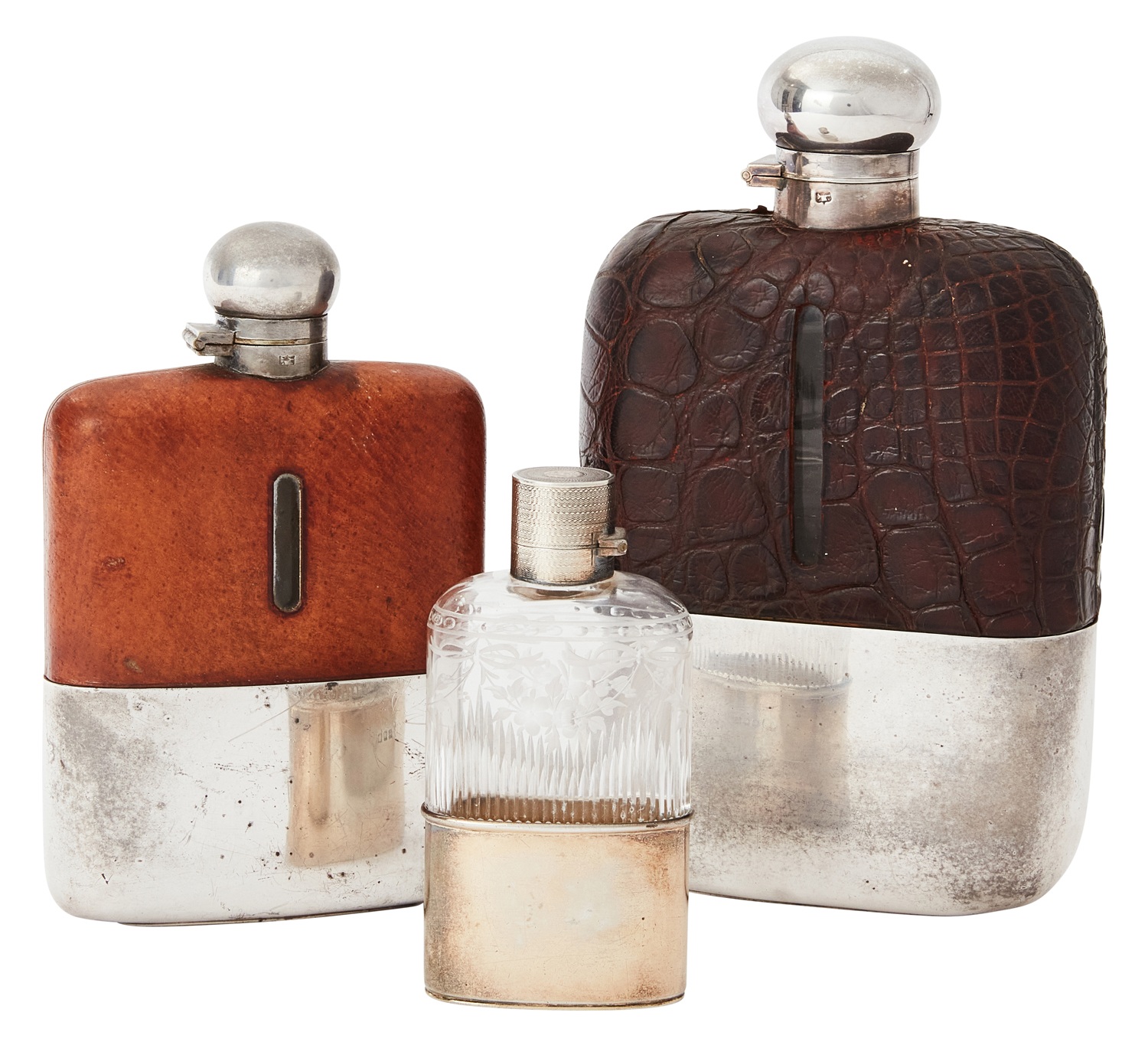 The silver gilt flask maker's mark of Drew & Sons, Piccadilly London 1927 with engraved glass body and engraved stopper; the other two by James Dixon & Sons. (3)