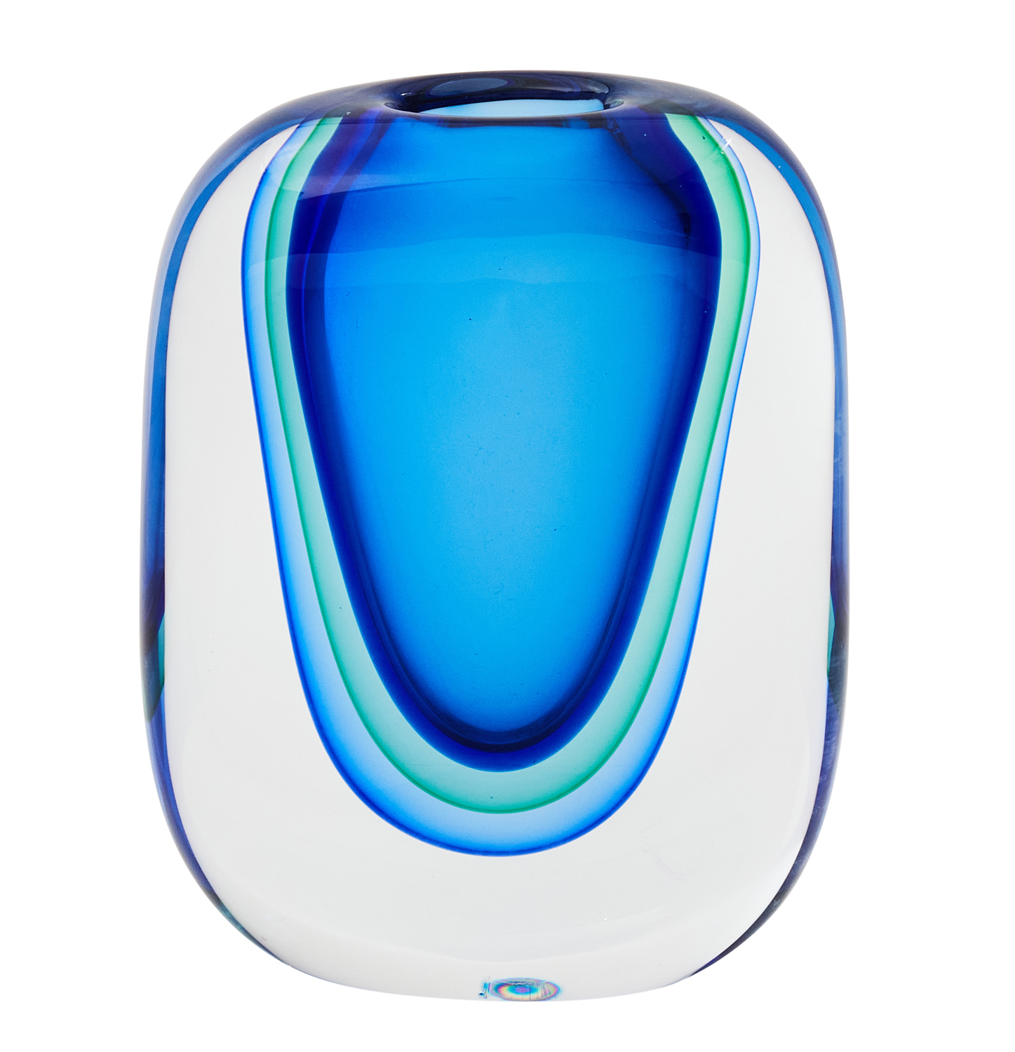 The flattened oval form with layers of blue and green within a clear glass body, etched signature to base: Fabio Onesto / Murano.