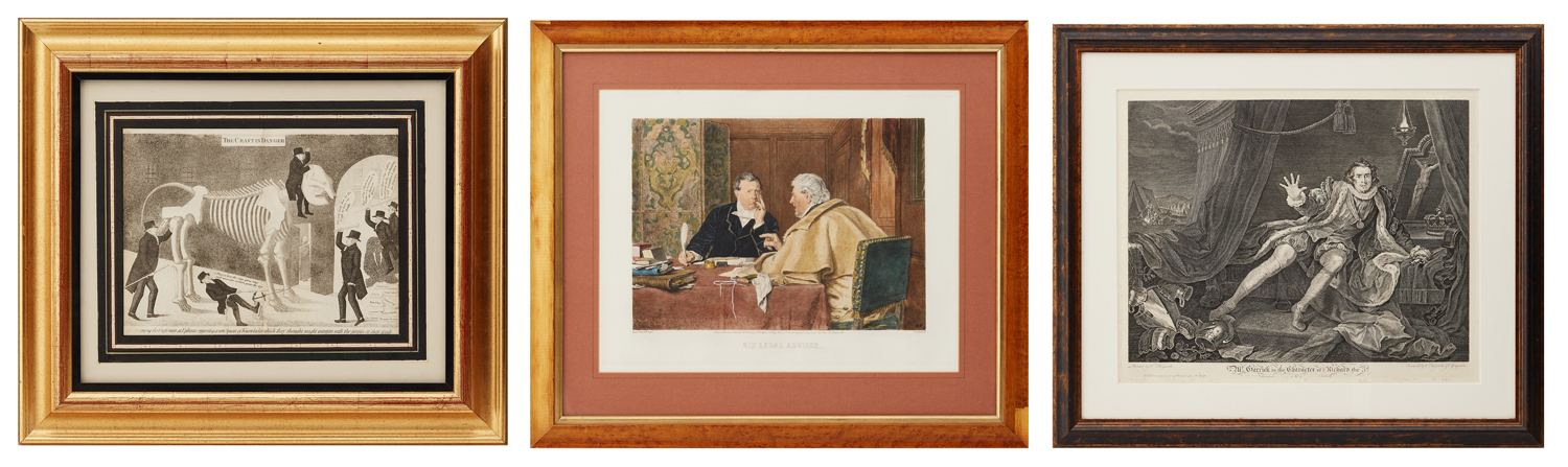 Comprising: 'Mr Garrick in the Character of Richard III' after William Hogarth; 'The Craft in Danger' after John Kay; and 'His Legal Advisor' after Erskine Nicol.
