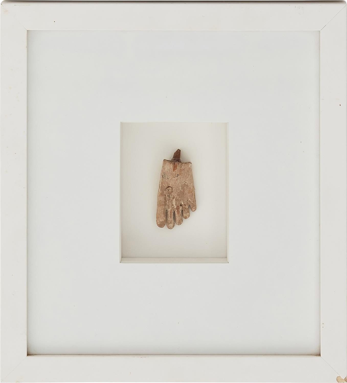 Unexamined out of frame; small losses to paint, small loss on top of instep, wear consistent with age.