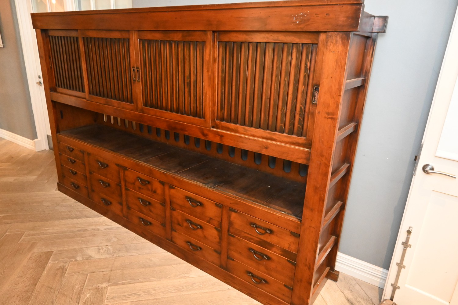 A LARGE ANTIQUE JAPANESE PINE KITCHEN CABINET (MIZUYA-DANSU) (A/F) (KEY IN OFFICE) (171H X 277W X 51D CM) (PLEASE NOTE THIS HEAVY ITEM MUST BE REMOVED BY CLIENTS OR CARRIERS AT THE CUSTOMERS EXPENSE. LEONARD JOEL STAFF CANNOT ASSIST CARRYING THIS ITEM)