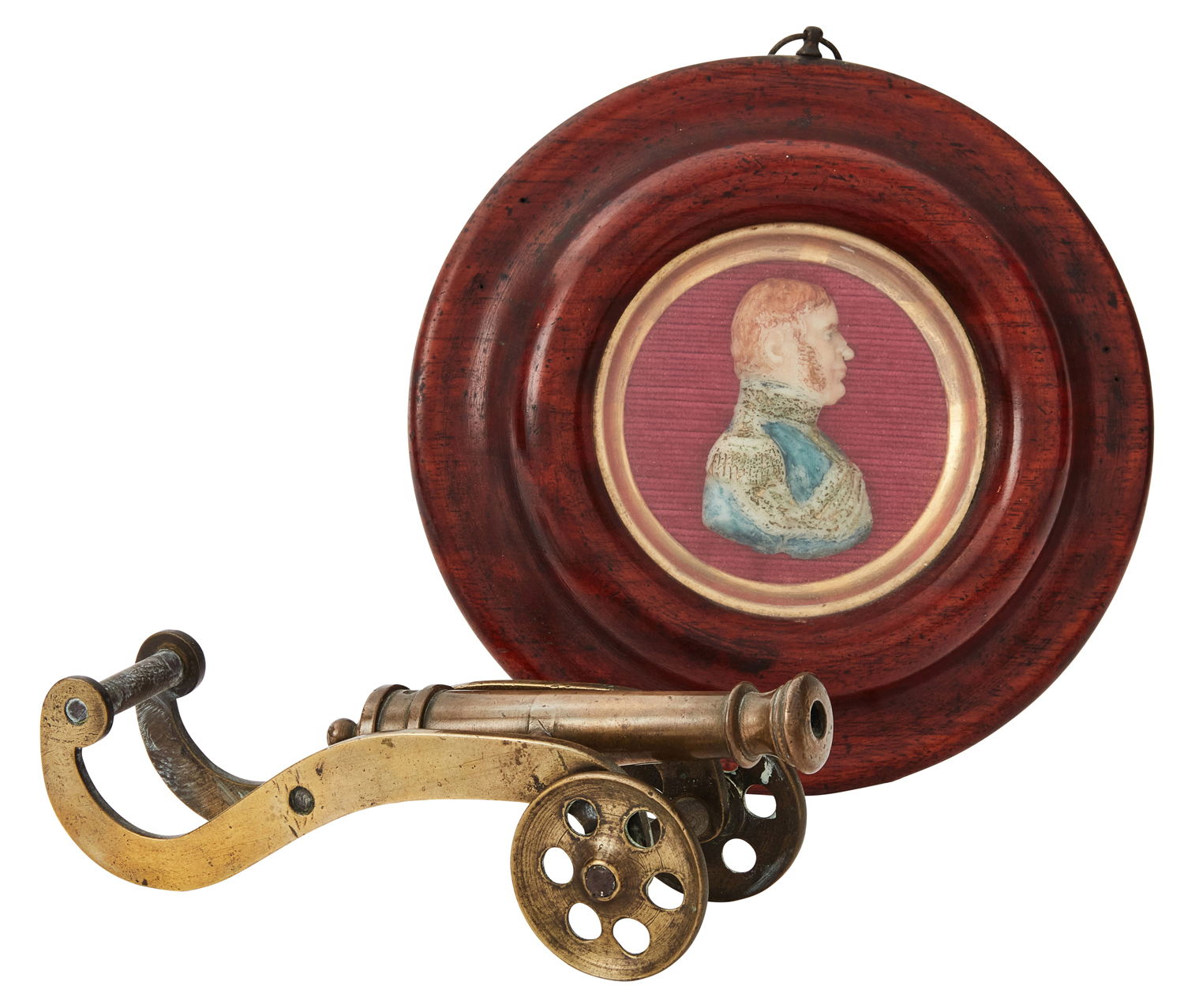 A BRONZE MINIATURE CANNON AND A WAX RELIEF PORTRAIT OF A MILITARY GENTLEMAN IN A CIRCULAR CEDAR FRAME