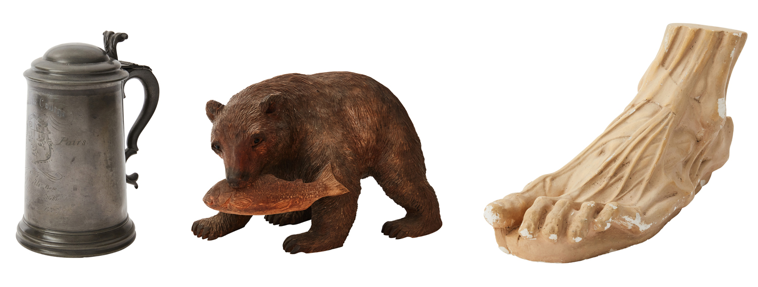 A JAPANESE WOODEN CARVING OF A BEAR, A PLASTER CAST OF A FLAYED FOOT AND A VICTORIAN PEWTER TANKARD