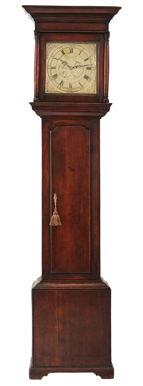 The moulded cornice above a square dial with turned columns to each corner above a plain trunk door and base; the brass dial with Roman hours and Arabic minutes and date aperture, rocaille engraving to the centre and rocaille spandrels, the 30-hour chain driven movement signed Porthouse, Barnard Castle.