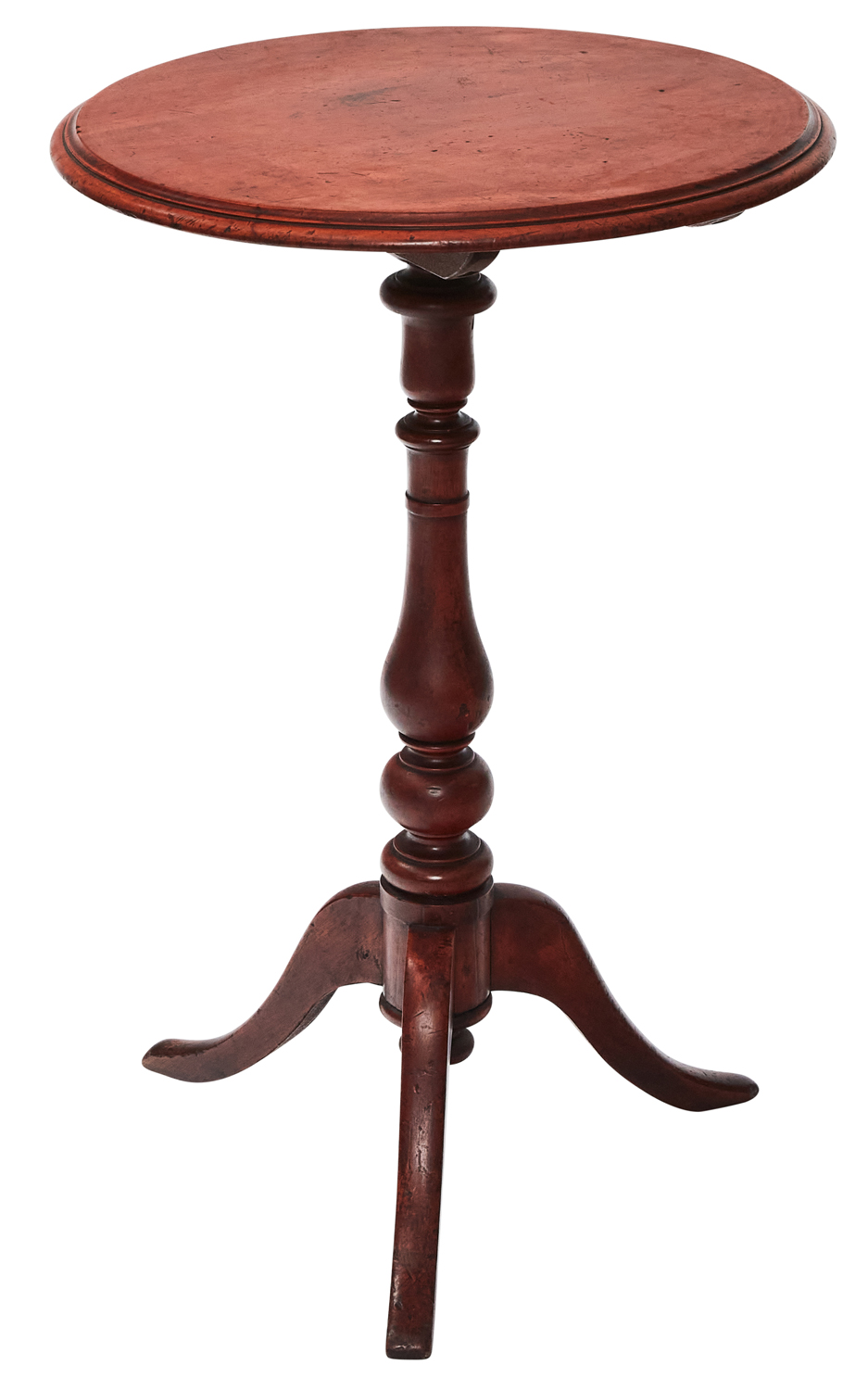 The circular tilt-top with moulded rim on turned baluster pedestal and three swept supports.