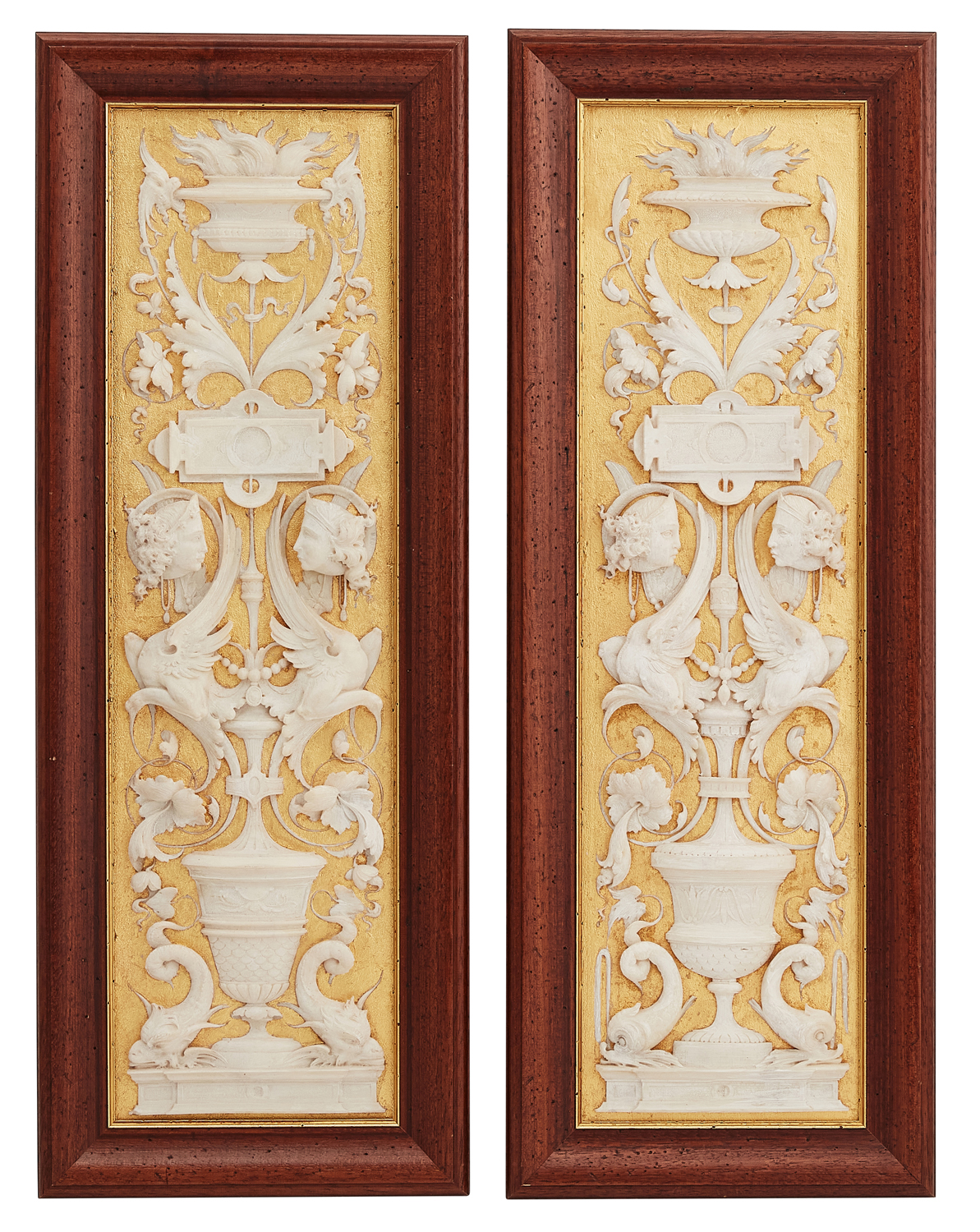 19th century, each with an elaborate design of grotteschi centred around an urn and foliate scrolls flanked by dolphins, on a gilded ground mounted on slate.