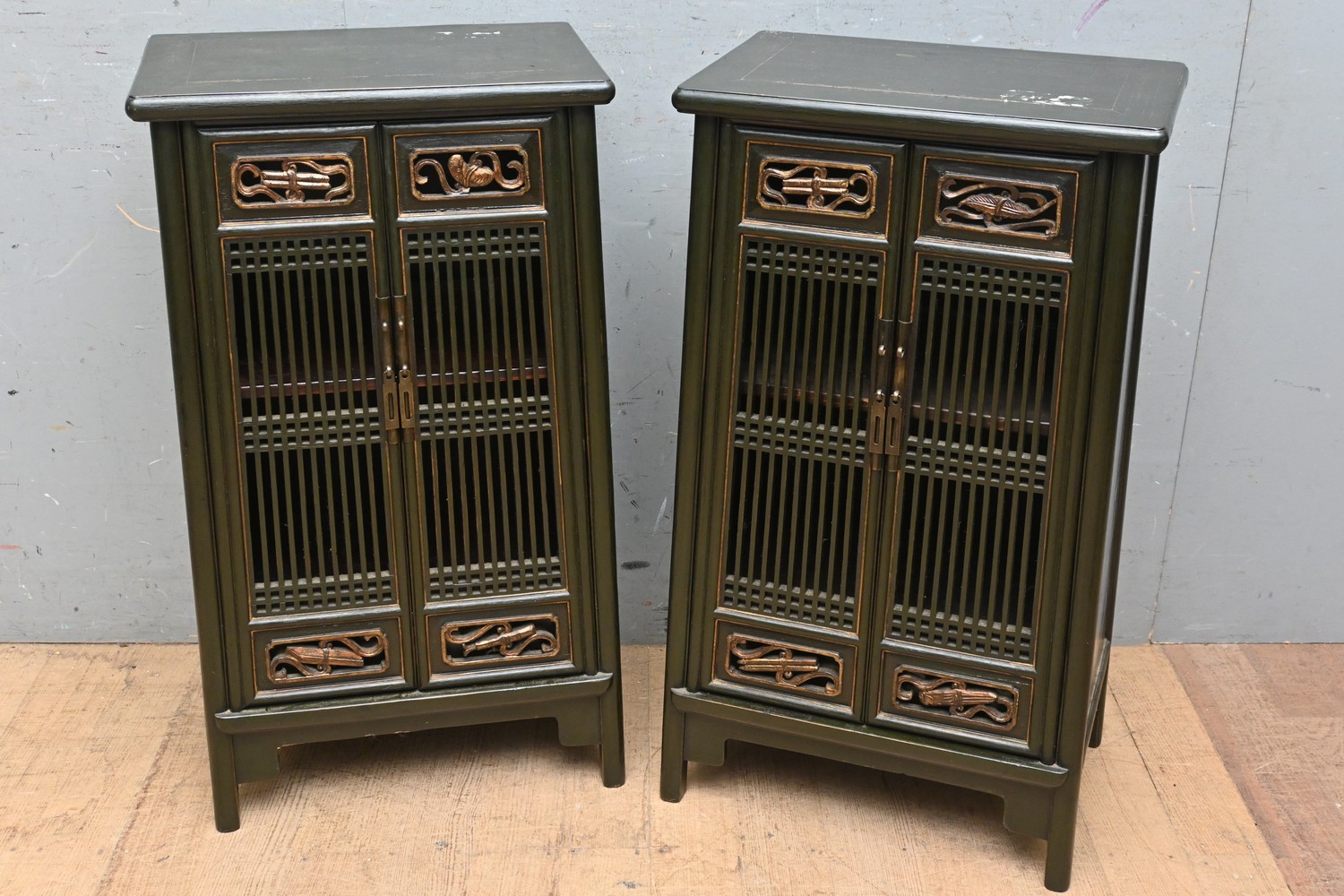A PAIR OF CHINESE SMALL BLACK LACQUERED CABINETS (A/F) (H90 X W50 X D32 CM) (LEONARD JOEL DELIVERY SIZE: LARGE)