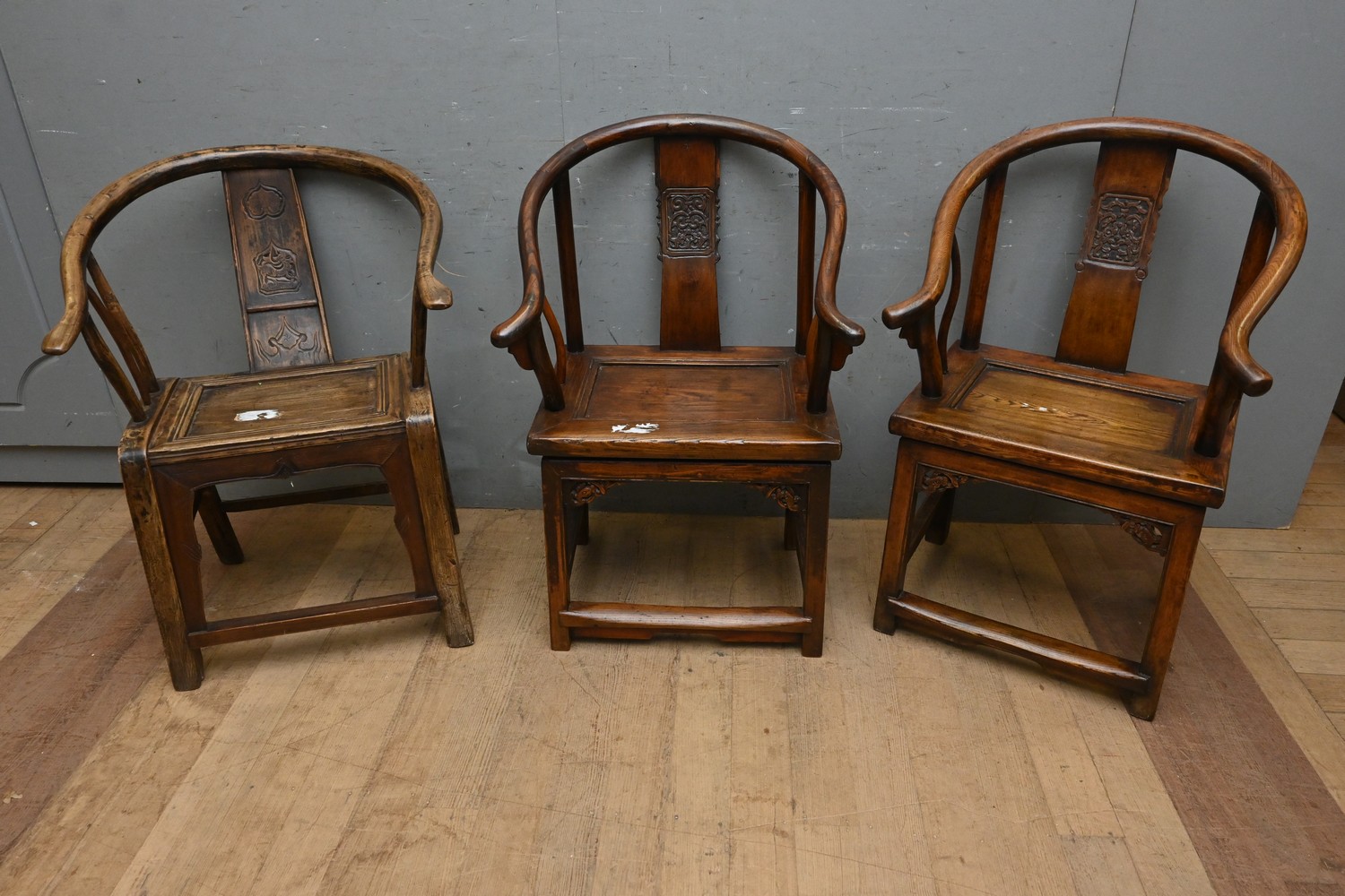 THREE SIMILAR CHINESE HARDWOOD HORSESHOE-BACK CHAIRS (H98 X W61 X D63 CM) (LEONARD JOEL DELIVERY SIZE: LARGE)