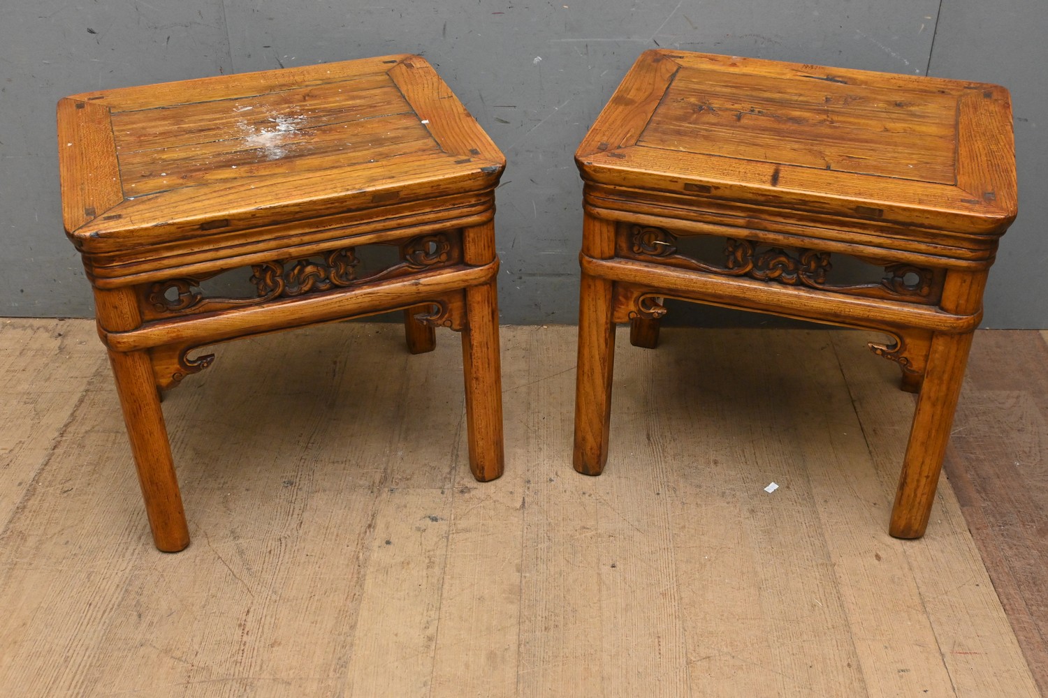 A PAIR OF CHINESE ELM SIDE TABLES (A/F) (H53 X W55 X D45 CM) (LEONARD JOEL DELIVERY SIZE: LARGE)