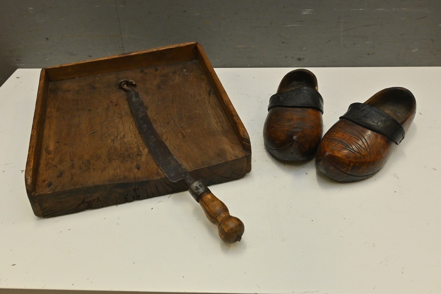 A COLLECTION OF WOODEN ITEMS INCLUDING CLOGS, BOARD AND KNIFE (W38 X D56 CM) (LEONARD JOEL DELIVERY SIZE: MEDIUM)