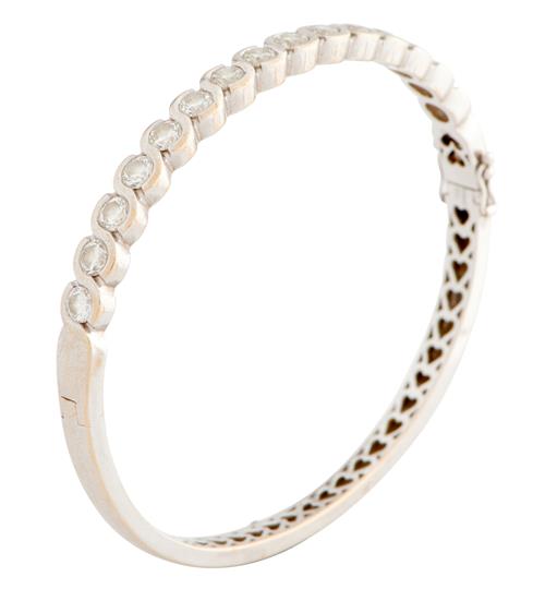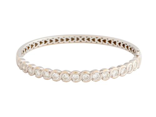 The oval hinged bangle, set at the top with fifteen collet-set brilliant-cut diamonds together weighing approximately 4.64 carats, inner diameter approximately 62mm.