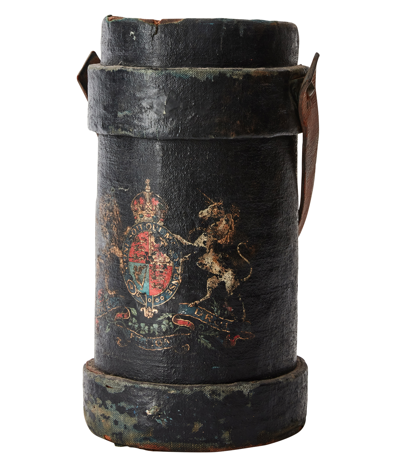Cylindrical with a leather strap, decorated with the arms of Queen Victoria.