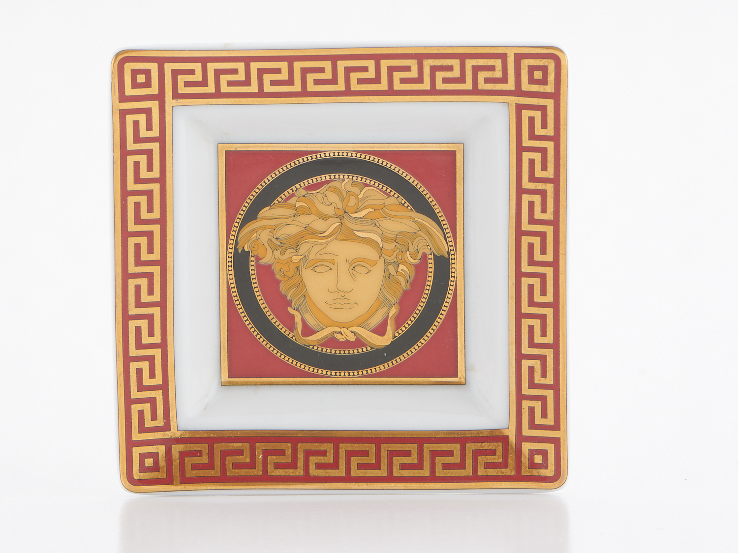 ROSENTHAL FOR VERSCACE, MEDUSA RED DISH - The petite square porcelain dish styled featuring a gold meander border encompassing a Medusa head, 8 x 8 x 1.3cm, boxed.