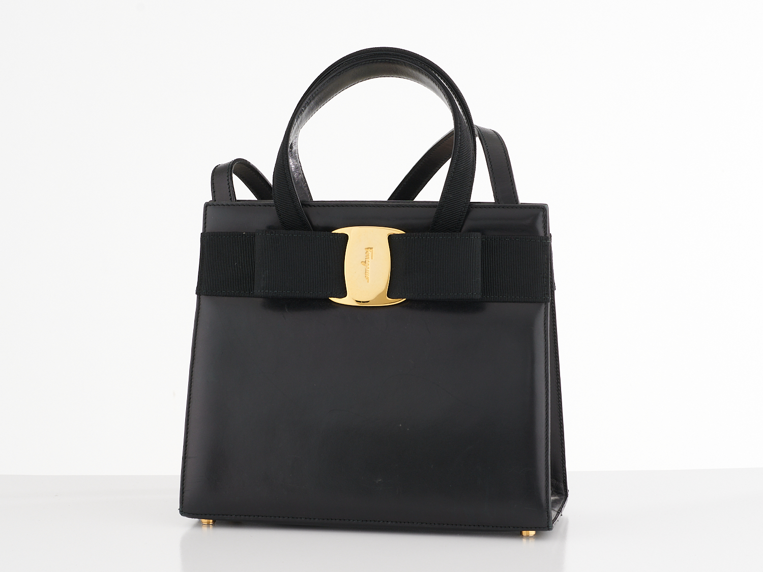 SALVATORE FERRAGAMO, HANDBAG - Styled in black leather, with grosgrain trim and central Vara bow, accompanied by optional shoulder strap, 21 x 34 x 10cm.
