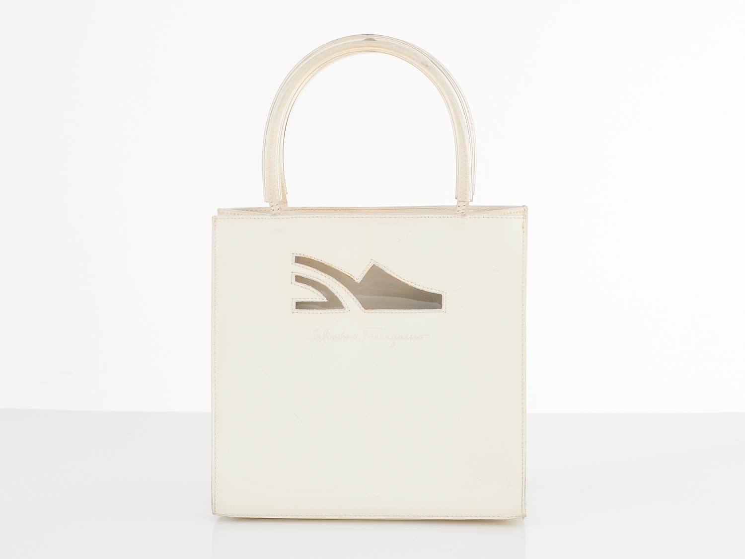SALVATORE FERRAGAMO, VINTAGE HANDBAG - Styled featuring a clear tubular handle, with body in white patent leather, 20 x 20 x 9cm.