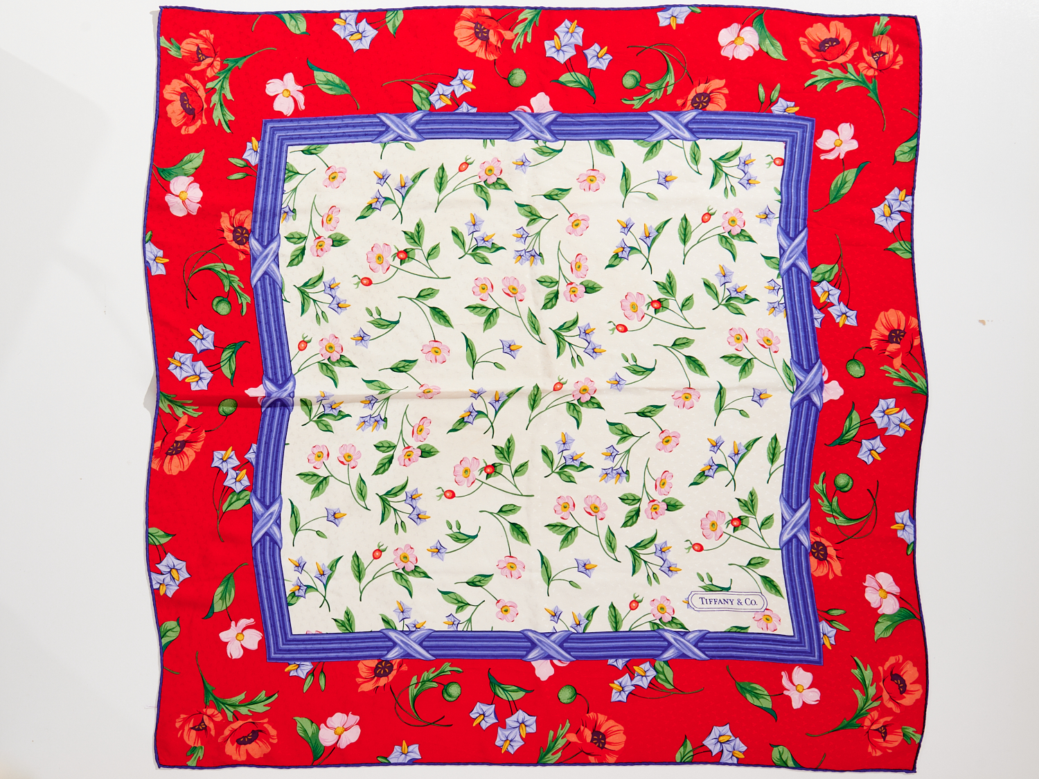 TIFFANY & CO, SILK SCARF - Styled silk jacquard depicting flowers to a cream background, within a red border and electric blue rolled edges, 90cm squared.