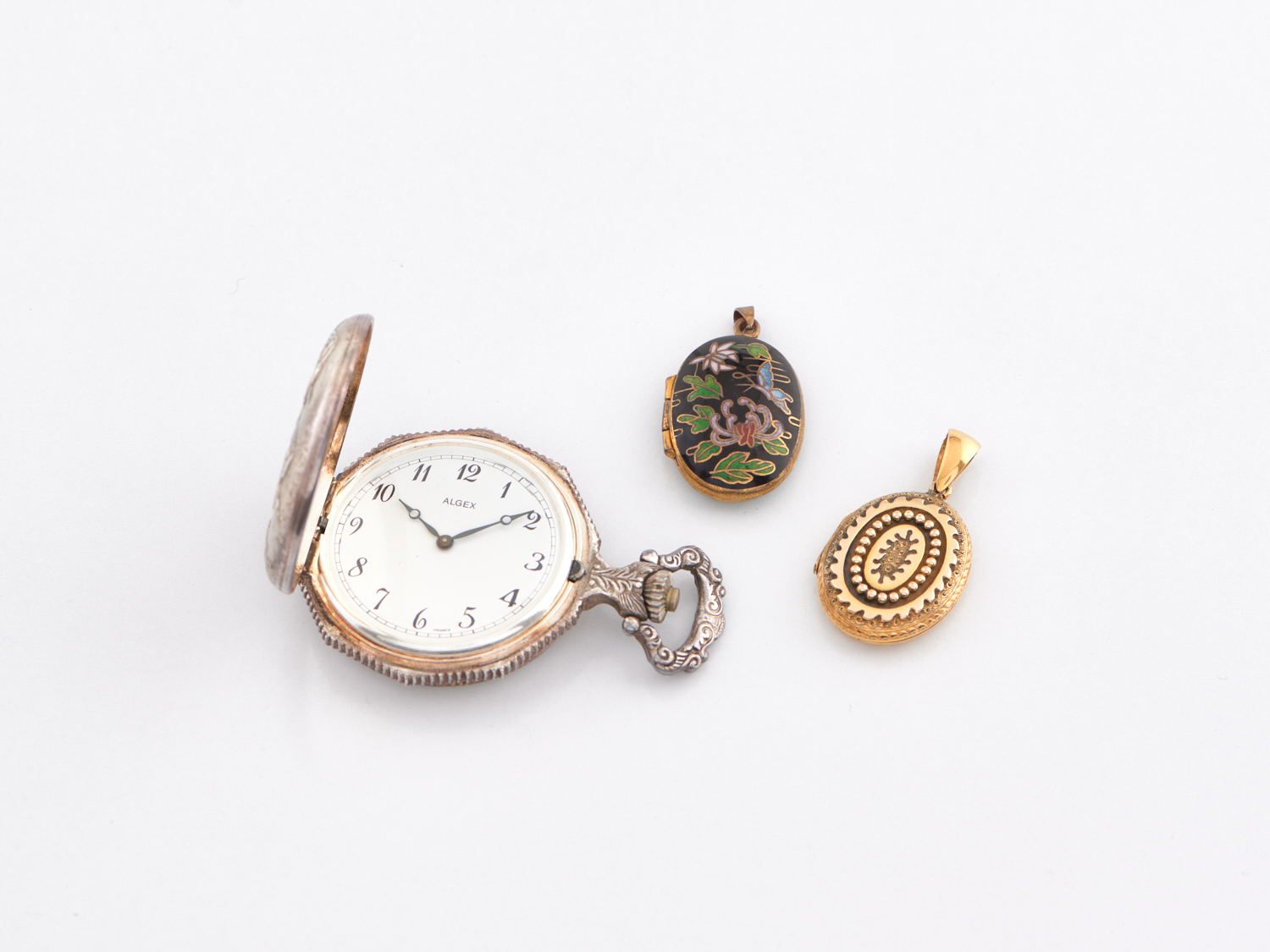 A POCKET WATCH BY ALGEX, SILVER PLATED, AN OVAL LOCKET IN BASE METAL AND AN OVAL EMANELLED CLOISONNE LOCKET