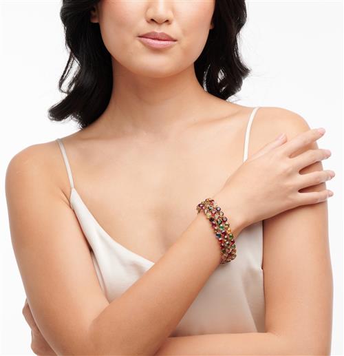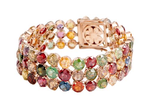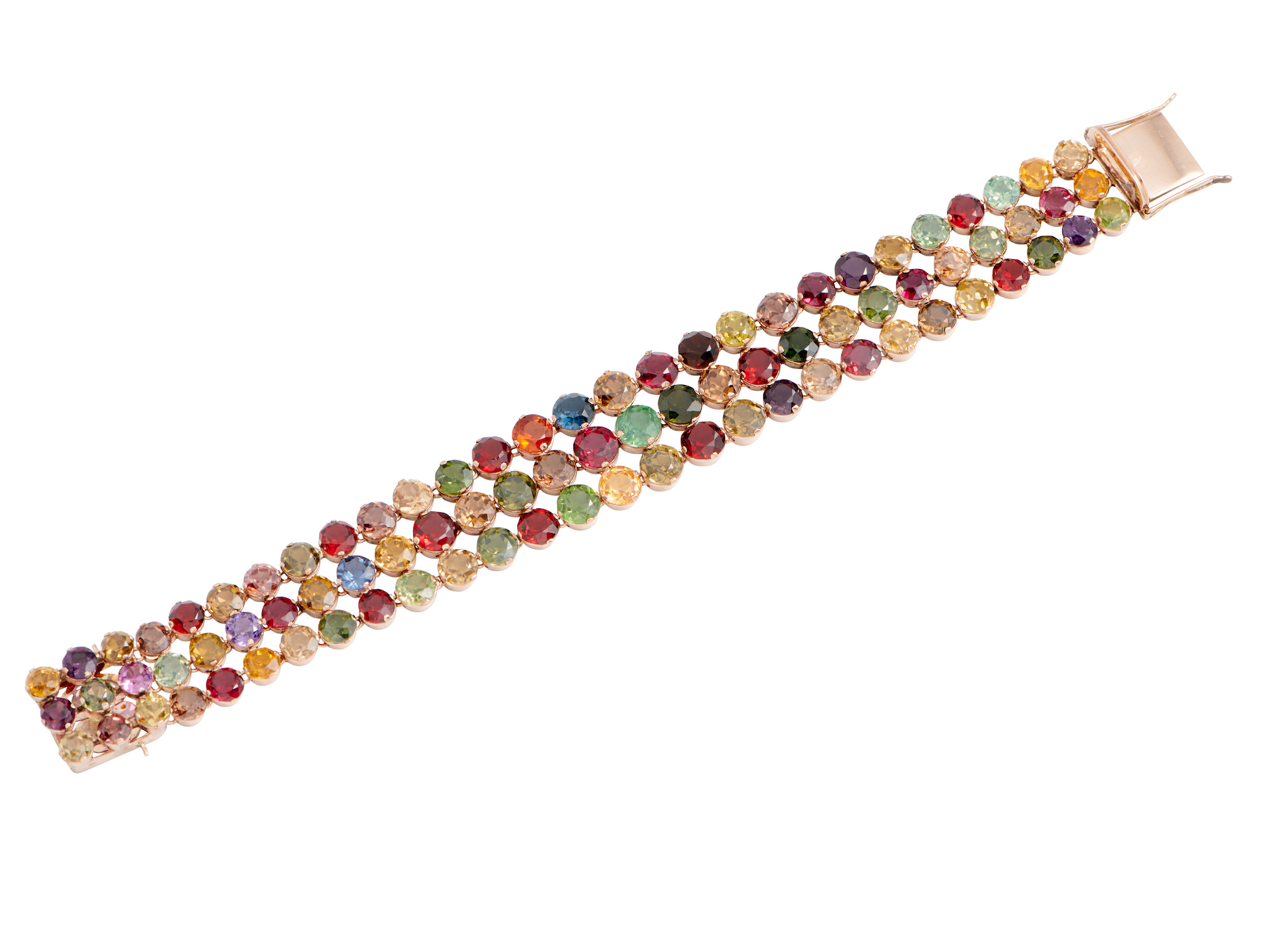 The articulated strap, comprising a triple row of multicoloured claw-set circular-cut semi-precious gemstones, completed by a box clasp, length approximately 190mm.