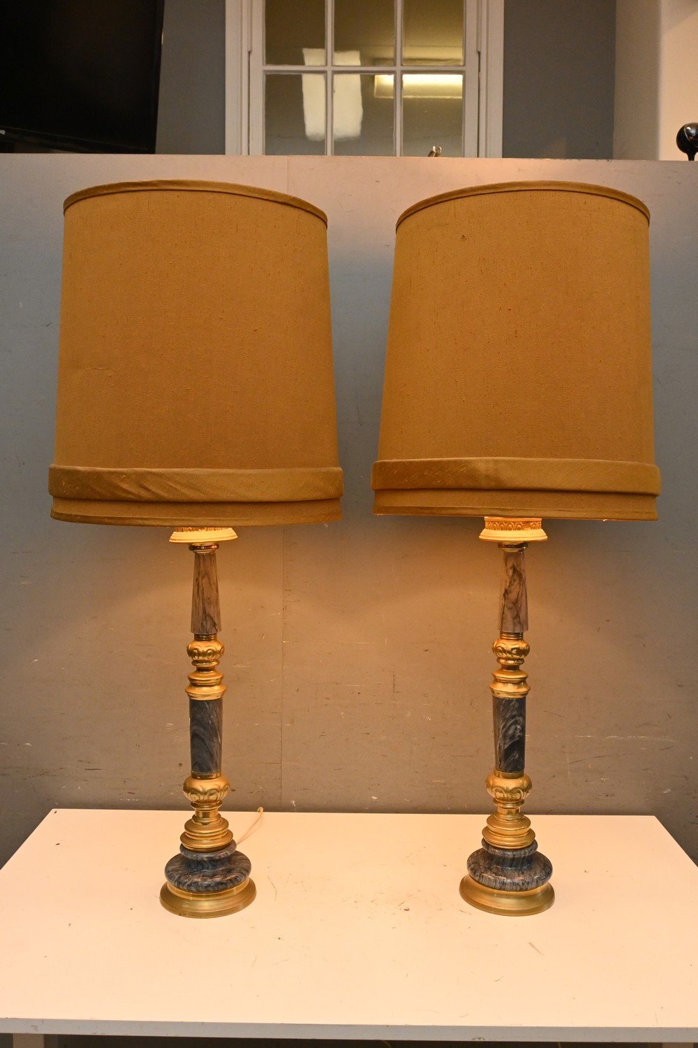 A PAIR OF AMERICAN EMPIRE STYLE LAMPS (A/F) ( 108H X 43 DIMAETER CM) (LEONARD JOEL DELIVERY SIZE: LARGE)