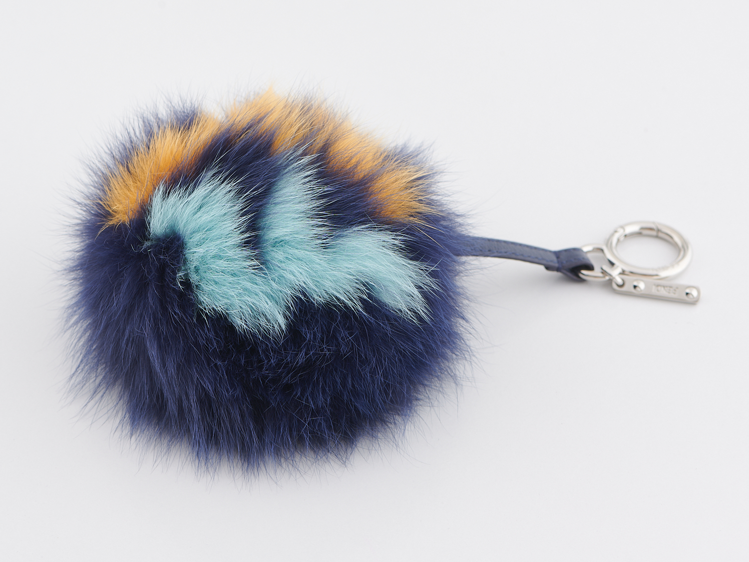 FENDI, POM POM CHARM - Styled in multicoloured fox fur, with lamb leather strap, and silver tone hardware, accompanied by box and dust bag.