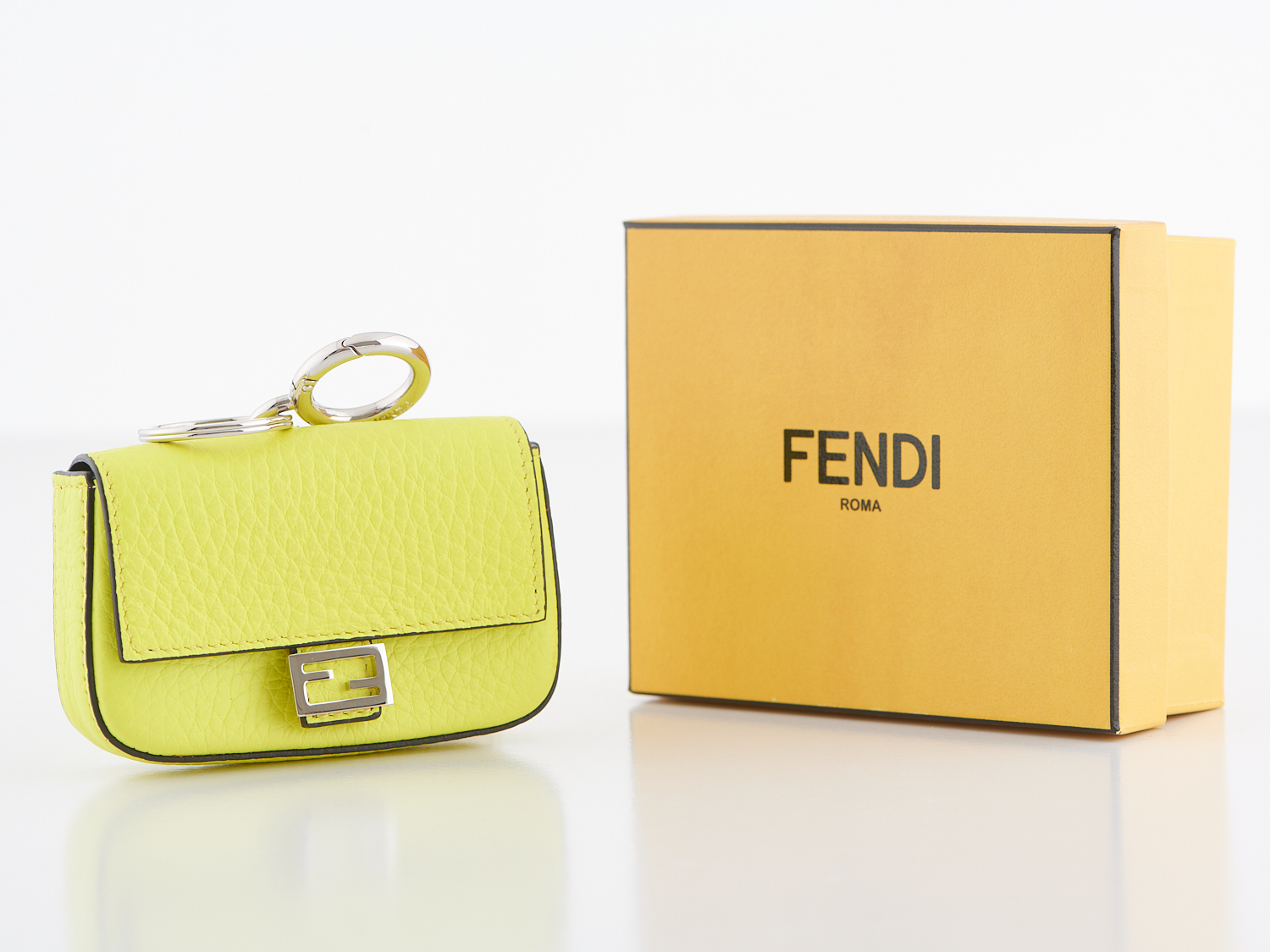FENDI, NANO BAGUETTE CHARM - Styled in acid yellow leather, with silver tone hardware, accompanied by box and original dust bag, 10.5 x 6.5 x 2.5cm.