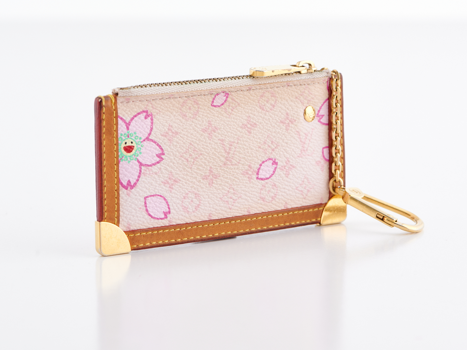 LOUIS VUITTON, LIMITED EDITION KEY PURSE - Styled in limited edition monogram by Takashi Murakami, with full leather interior and gold tone hardware, 12.5 x 7cm.