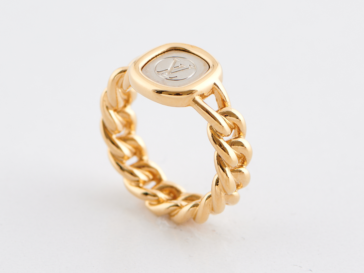 LOUIS VUITTON, RING - The chain link design styled in gold tone metal, with silver tone logo plaque, ring size L, with original pouch.