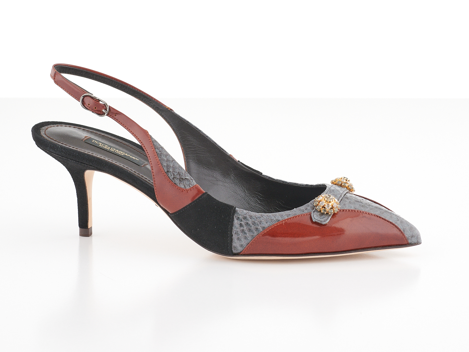 DOLCE & GABBANA, KITTEN HEELED SLINGBACKS - Styled in grey snakeskin, maroon patent leather and black suede, with jewelled decoration, marked size 40, boxed, new.