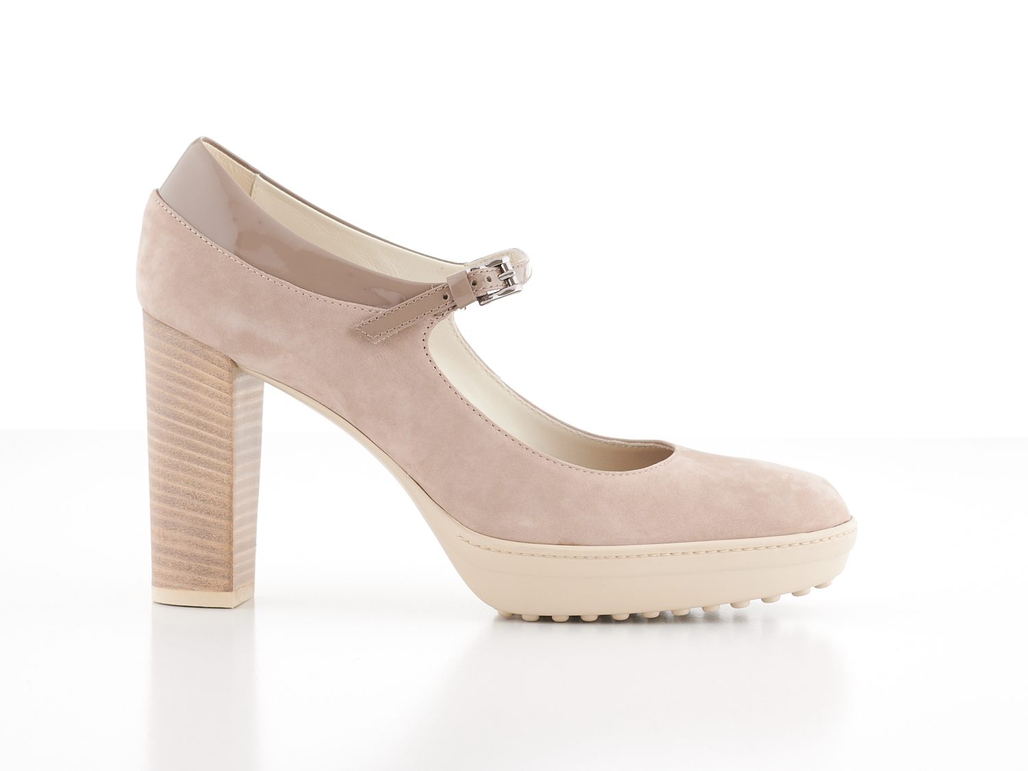 TOD'S, MARY-JANE STYLE PLATFORM HEELS - Styled in taupe suede, with taupe patent leather strap and gunmetal buckle, with box and dust bag, marked size 40.